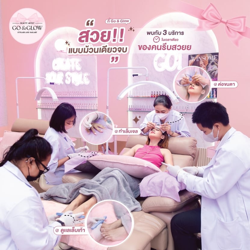 Welcome to Go and Glow, where we provide comprehensive beauty services that can be done simultaneously, maximizing your time. Our valued customers can enjoy a wide range of services, including nail treatments, spa services, gel manicures, nail art, eyelash extensions, eyelash lifts, body waxing for all areas, including bikini waxing, eyebrow shaping, lip tattooing, and much more. At Go and Glow, we are committed to delivering exceptional customer experiences with premium products and the expertise of our skilled professionals.
